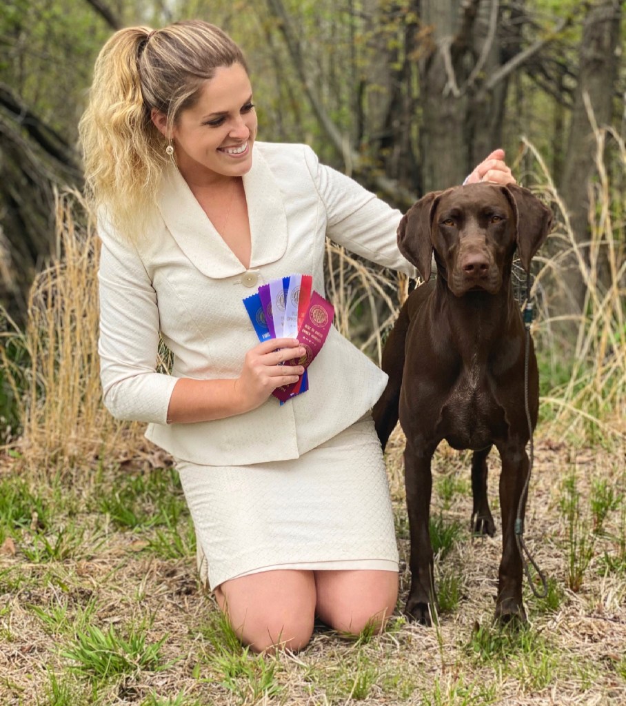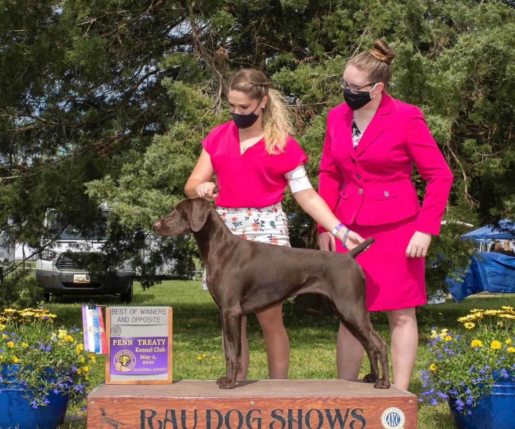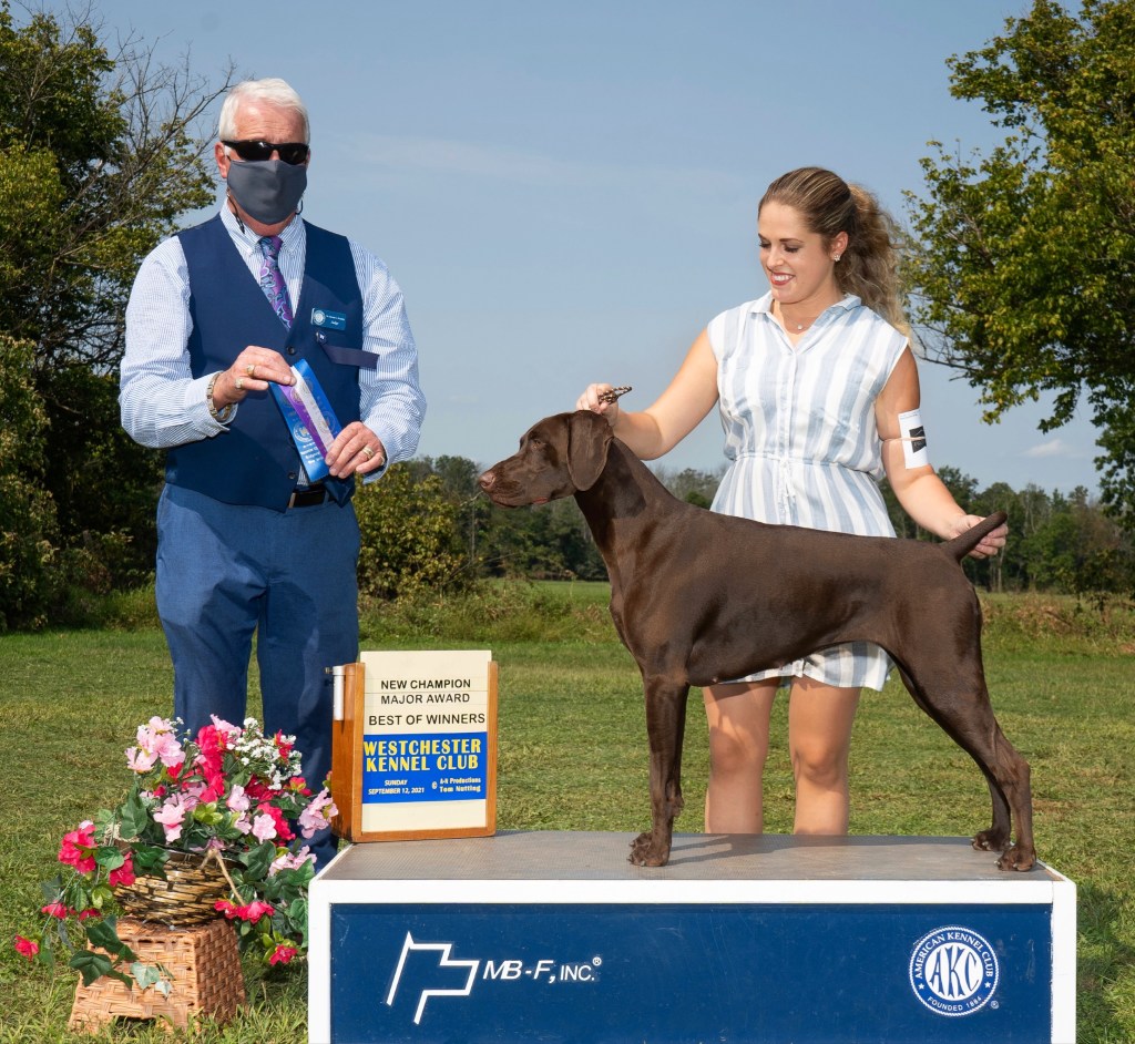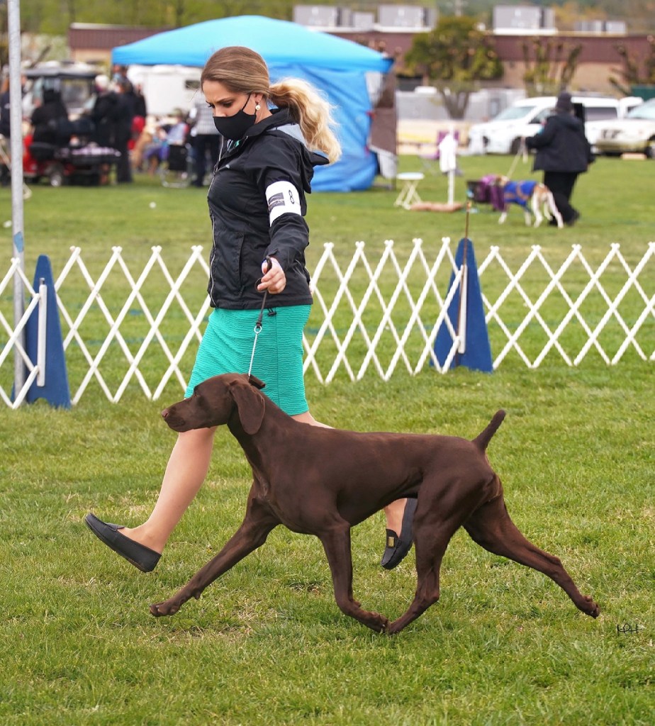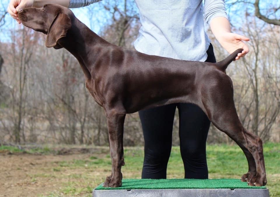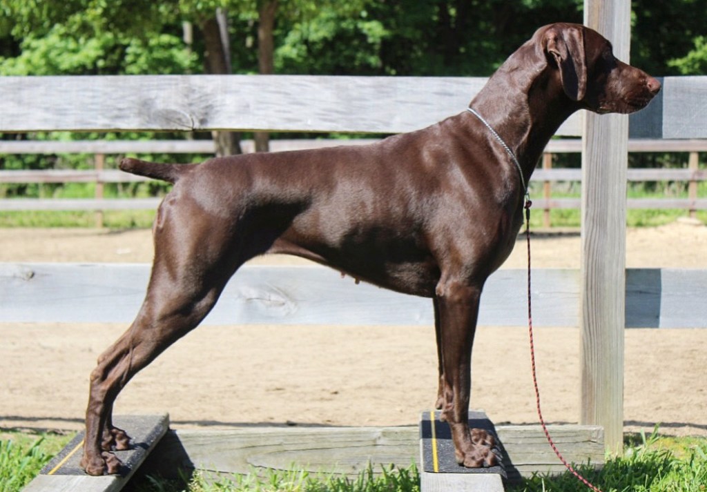 MiKarma N Shomberg Perfect Crime aka Bonnie is a beautiful solid liver female bred by Tina M. Craig and Sharon Dattilio. Before Bonnie turned one year old she obtained her DS, JH, RN, & TKN. Bonnie is a Champion through AKC & UKC. Bonnie is a very bold female who is always ready to work & please. Bonnie is currently training for her Senior Hunter through AKC.